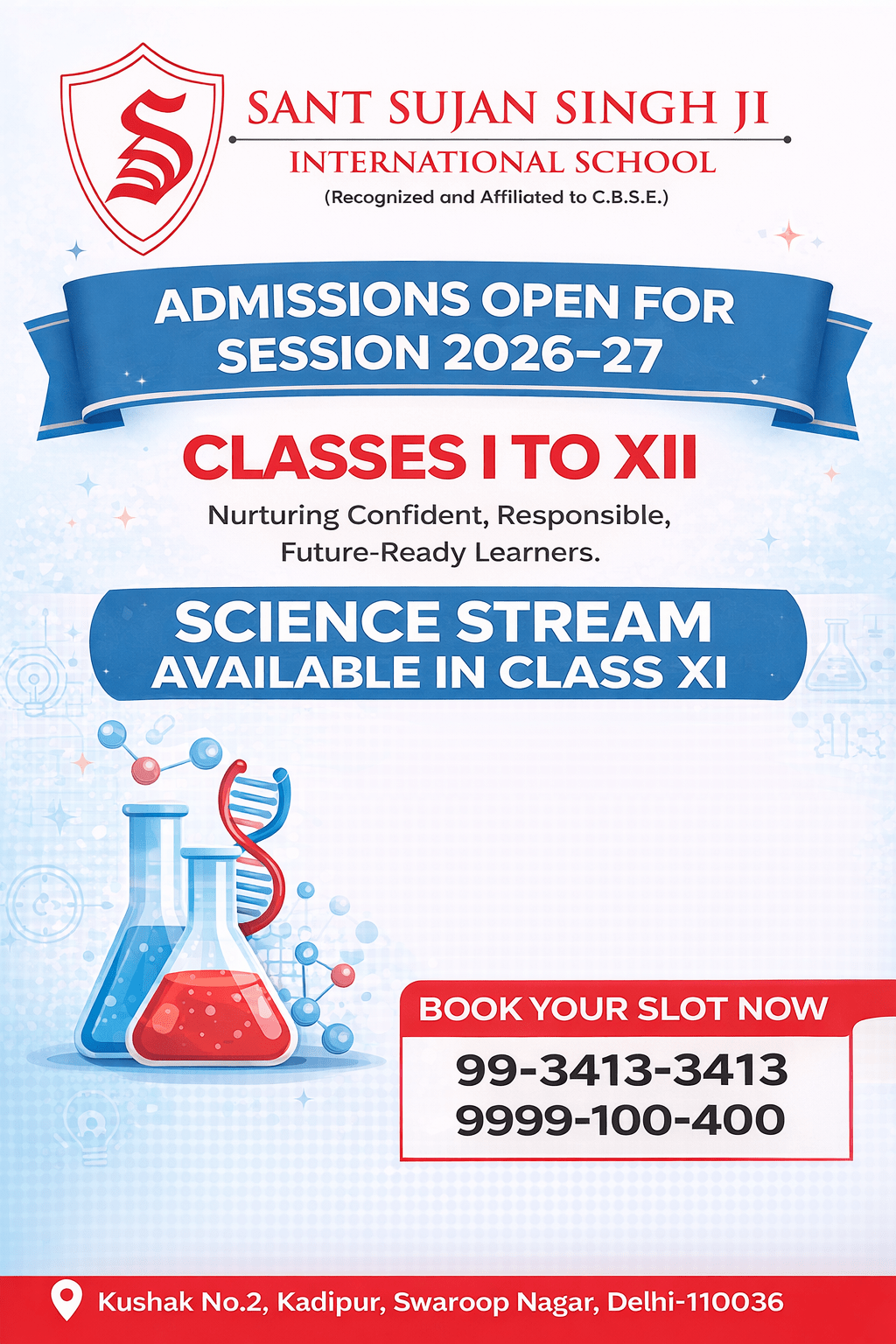 Sant Sujan Singh Ji International School, recognized as the Best CBSE school in Swaroop Nagar, Delhi. Offering classes from Nursery to 12th with streams in Science, Commerce, and Humanities, we focus on academic excellence, holistic development, and state-of-the-art facilities. Enroll now for a brighter future!